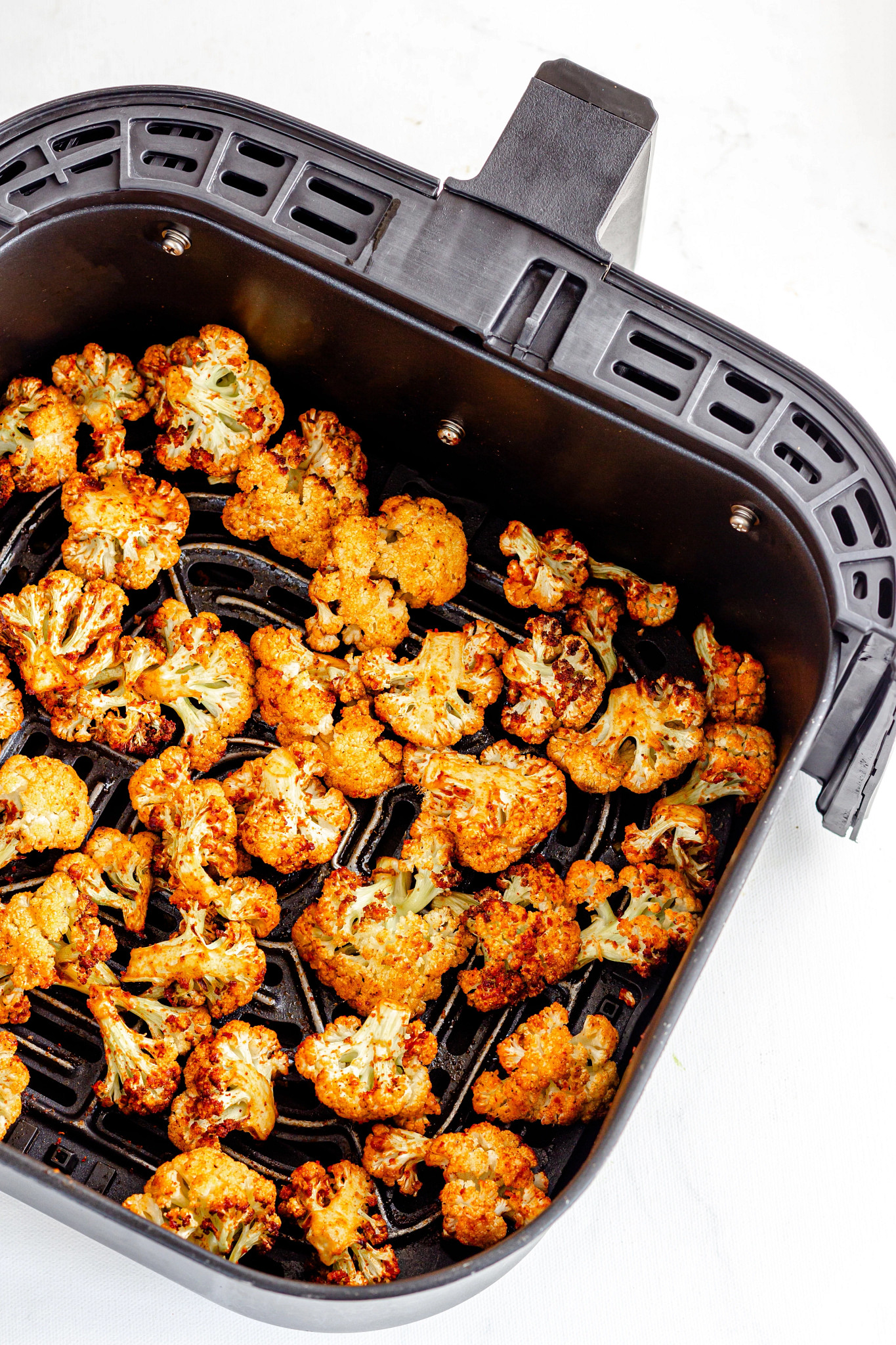 Air-fry for 8-9 minutes, then gently flip each floret over with a spatula. Brush each lightly with the wing sauce, then cook for an additional 5-10 minutes, or until the cauliflower is dark and crisp around the edges. Remove from the air fryer and brush with more wing sauce if needed. Serve warm with blue cheese dressing or ranch, if desired.